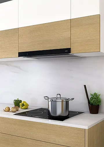 Wie selbstverständlich fügt sich die minimalistische Einbauhaube Glassline mit ihrer edlen Glasblende in sattem Schwarz in das Küchenambiente ein. Zurückhaltung auf ganzer Linie macht diese Dunstabzugshaube aus: das innovative Bedienfeld zeigt sich erst bei Berührung, die effiziente Technik verbirgt sich diskret hinter dem Küchenschrank und die stilistische Glasfront setzt dezent ein Highlight in die Küchenzeile. Die dimmbare Kochfeldbeleuchtung mit einstellbarer Farbtemperatur sorgt jederzeit für perfektes Licht beim Kochen. Zurückgenommes Design trifft auf meisterhaften Dunstabzug.