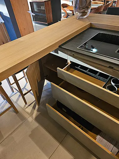 Diese exklusive TEAM 7 Premiumküche vereint zeitloses Design mit kompromissloser Qualität. Ausgestattet mit modernsten Miele-Elektrogeräten, edlen Keramikfronten in der Farbe Phedra und einer großzügigen Keramik-Arbeitsinsel mit integrierter Echtholz-Theke wird sie zum Mittelpunkt des Wohnraums. Der massive Eiche-Korpus, weiß geölt, unterstreicht die natürliche Eleganz, während massive Edelstahl-Stangengriffe klare Akzente setzen. Ein Raumtrenner aus Massivholz Eiche sowie eine integrierte Umluft-Dunstabzugshaube runden das luxuriöse Gesamtbild perfekt ab.