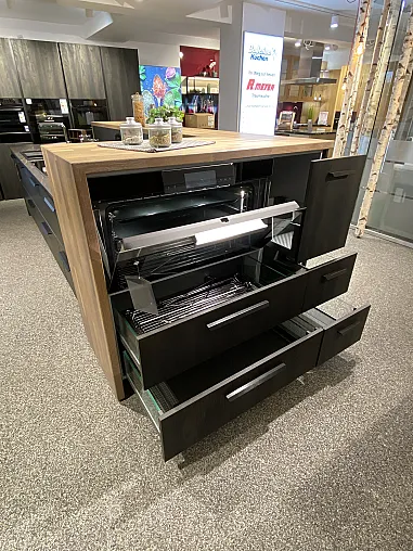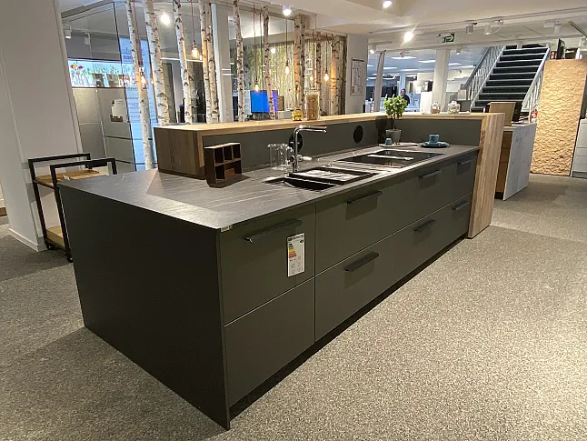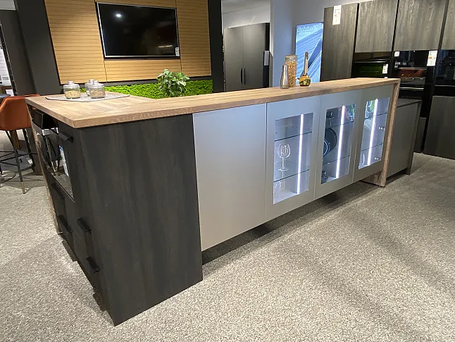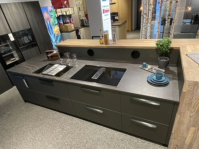 Diese Küche bietet nicht nur luxuriöse Standards, sondern auch Flexibilität bei der Planung. Mit einer großzügigen Insel und integrierter Massivholz Theke ist sie sowohl funktional als auch gesellig.