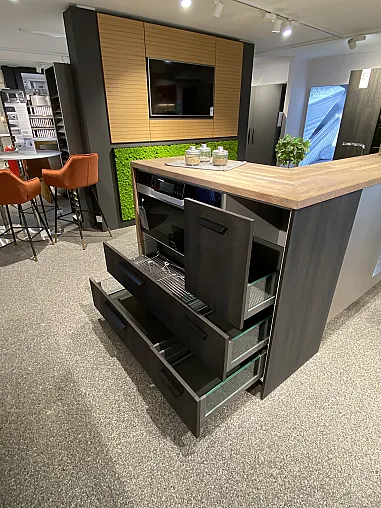 Entdecken Sie diese exklusive Ballerina-Küche, die durch ihre zeitlose Eleganz und hochwertige Ausstattung besticht. Die Kombination aus Burnt Wood Nachbildung und Smartglas Karbonmetallic verleiht Ihrem Zuhause einen Hauch von Luxus. Integriert in das Design ist eine robuste Dekton-Arbeitsplatte "Laurent", die sowohl optisch als auch funktional überzeugt.