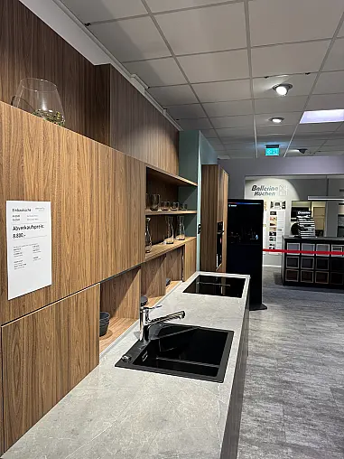 Zum Verkauf steht eine neuwertige Häcker Systemat Küche aus der Ausstellung, die stilvolle Eleganz mit durchdachter Funktionalität vereint. Die Fronten bestehen aus einer modernen Kombination aus edlem Nussbaum-Holzdekor und Beton-Grau, ergänzt durch eine Arbeitsplatte in steinähnlicher Optik. Die wohnliche Gestaltung und Farbgebung machen die Küche besonders geeignet für offene Wohnbereiche.
