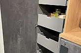 Das Frontdekor aus Spachtelbeton graphit und die Arbeitsplatte in einem warmen Holzdekor Alteiche Repro setzen stilvolle Akzente. Die grifflosen Schränke verkörpern minimalistische Eleganz und machen die Küche zu einem echten Hingucker.