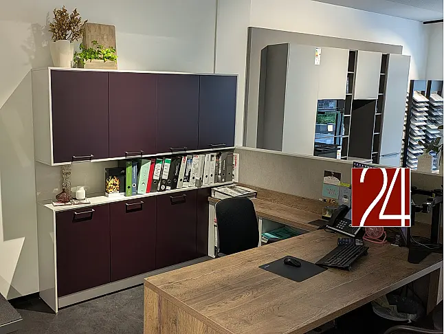 Softmatte Brombeer-farbene Lackfronten wurden mit glänzend lackierten Fronten im der Trendfarbe "Satin/Taupe" kombiniert.