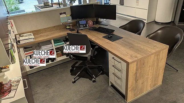 Erhöhen Sie die Produktivität Ihrer Home Office-Tage durch diese schicke Büro-Einrichtung. Durch eine geschickte Kombination von Schubläden, Regalen und Schränken erhalten Sie optimalen Zugang zu Ihren Akten und Büromaterialien.