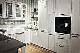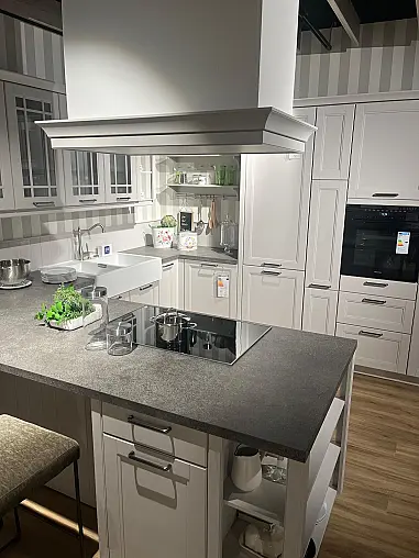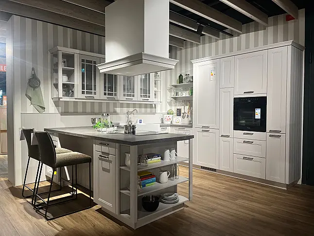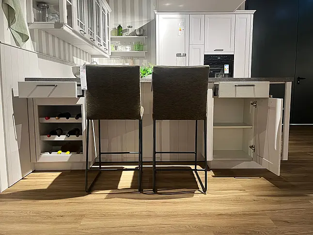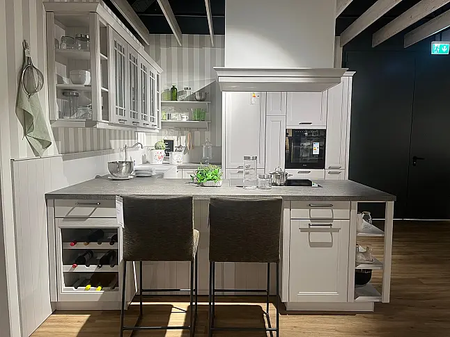 Die Landhausküche ist im hellen Holz und überwiegend weiß gestaltet und verbindet klassische Elemente mit einem modernen Stil. Im Zentrum steht eine große Kücheninsel mit dunkler Arbeitsplatte, offenen Regalen und Sitzplätzen. Die Schränke im Landhausstil mit Glastüren sowie der integrierte Backofen sorgen für ein aufgeräumtes Gesamtbild.