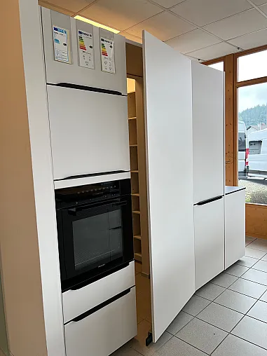 Schüller UMA Uni matt Moderne Küchenzeile mit Insel in Muschelweiss und Arbeitsplatte Mamor Vena