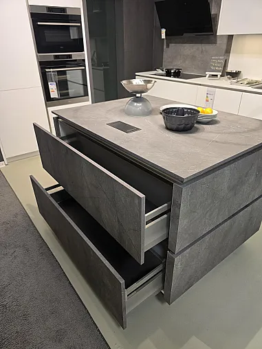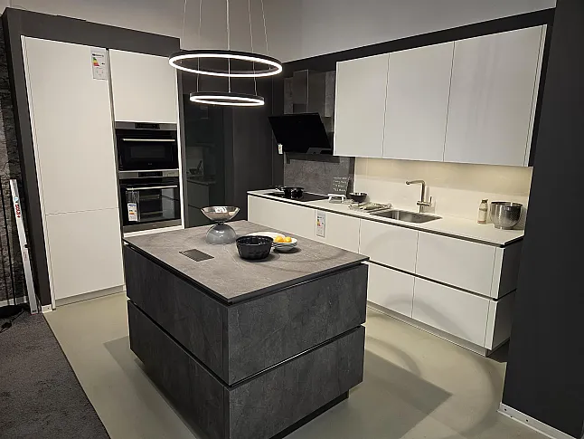 Häcker Top Soft kristallweiß / Merkur Marmor grau Küche grifflos mit Insel modern