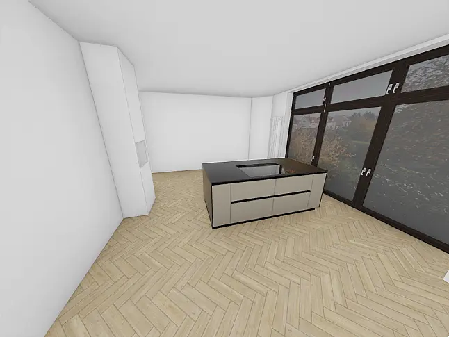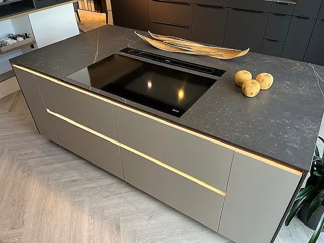 Mit ihrem modernen Design beeindruckt die Kücheninsel durch ihr mattes Lackfinish in Greige, das Eleganz und Moderne verkörpert. Die Fronten in seidenmattem Lack und Keramik verleihen ihr eine edle, zeitlose Ausstrahlung. Planen Sie Ihre individuelle Kücheneinrichtung mit flexiblen Einzelteilen und dieser großzügigen Insel, die sowohl als Arbeitsfläche als auch als geselliger Treffpunkt dient.