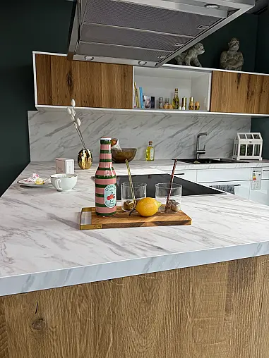 Kristallweiße Hochglanz Küche mit Details aus Räuchereiche und einer Carrara Schichtstoff Arbeitsplatte 38 mm. Mit schwarzen Griffen.