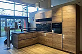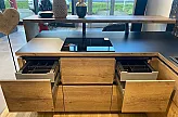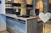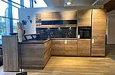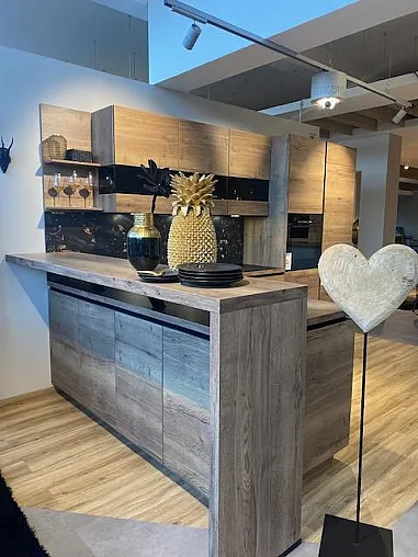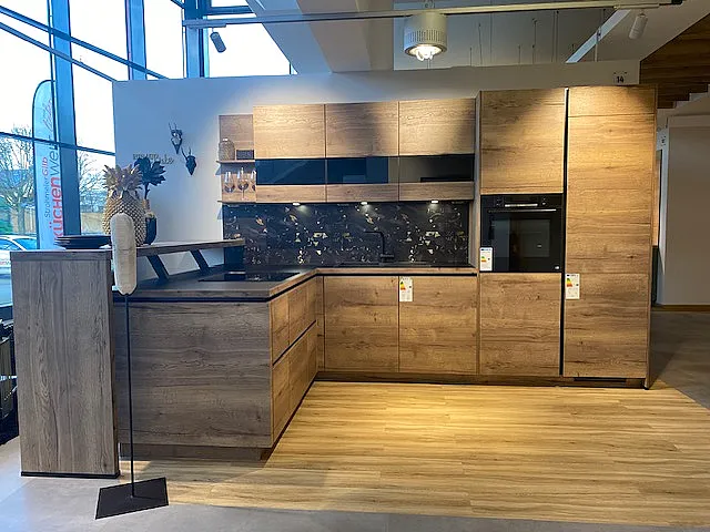 Koje 14 (Rheinstetten) zeigt eine moderne Nobilia-Küche in L-Form mit integrierter Theke – ideal zum Kochen und für geselliges Beisammensein. Ausgestattet mit Junker-Einbaugeräten sowie einem Elica Kochfeld mit integriertem Dunstabzug überzeugt sie durch klare Linien, effiziente Abläufe und komfortable Funktion.