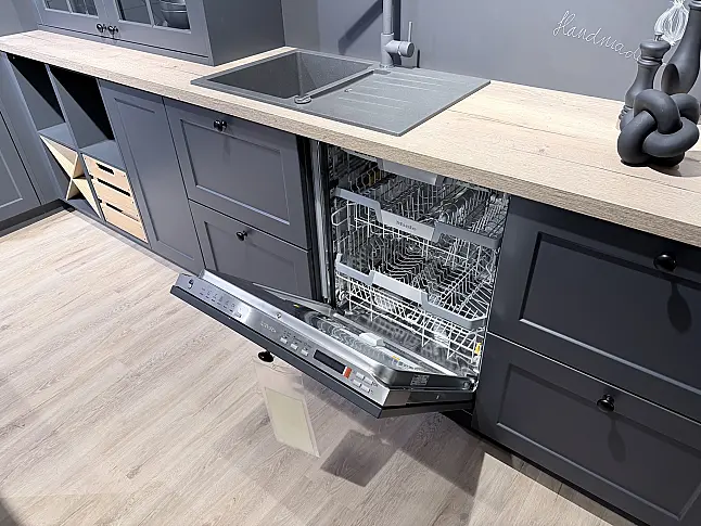 Diese Küche vereint den klassischen Country Style mit moderner Linienführung und hochwertiger Technik. Die Front Vienna in Satinlack Lavaschwarz verleiht der Küche eine außergewöhnlich elegante und zugleich kraftvolle Ausstrahlung. Die feine Kassettenoptik bringt handwerklichen Charme, während die matte, samtige Lackoberfläche für zeitgemäße Zurückhaltung und Tiefe sorgt.