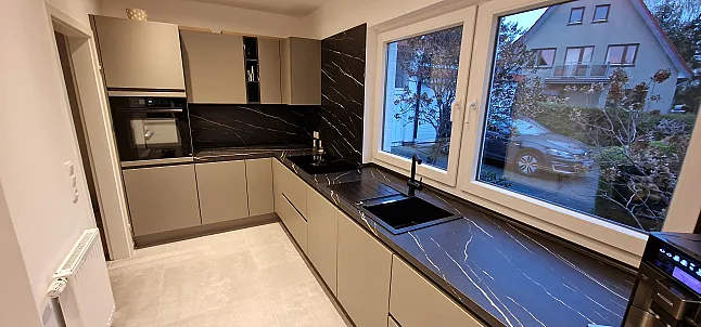 Diese Nobilia Musterküche verbindet elegante Optik mit hoher Planungssicherheit. Die taupegrauen Fronten wirken in Kombination mit der Marmor Venato Nero Nachbildung äußerst wertig und modern. Dank griffloser Ausführung, durchdachtem Stauraumkonzept eignet sich die Küche ideal für designorientierte Kunden, die Wert auf Komfort und klare Linien legen. Da alle Dekore weiterhin im Programm sind, lässt sich die Küche problemlos an Ihren Grundriss anpassen und bei Bedarf erweitern.