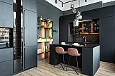 Diese moderne Designküche in Schwarz Matt steht für konsequenten Minimalismus, architektonische Klarheit und eine durchdachte Verbindung aus Ästhetik und Funktion. Die grifflose Gestaltung der Fronten unterstreicht den puristischen Charakter und lässt die Küche ruhig, hochwertig und zeitlos wirken. Die dunkle Farbwelt wird gezielt durch warme Lichtakzente, Glasflächen und feine Materialkontraste aufgelockert.