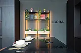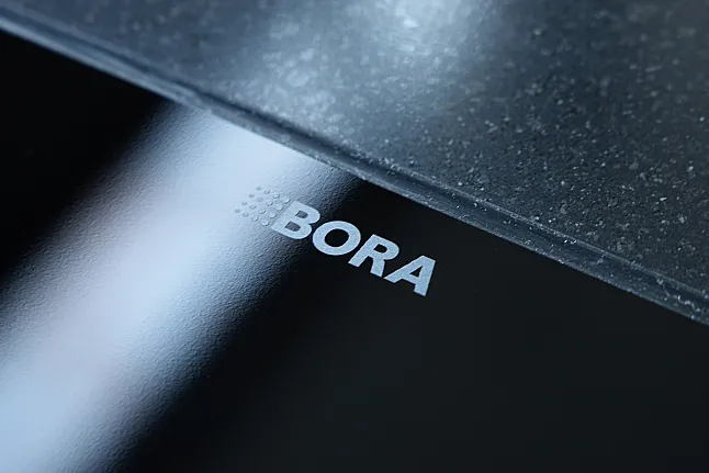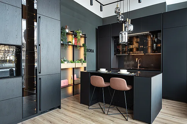 Ein weiteres Highlight ist das BORA M PURE Kochfeld mit integriertem Muldenlüfter, das flächenbündig in die Insel eingelassen ist. Es ermöglicht freies Kochen ohne klassische Dunstabzugshaube und unterstützt das offene, klare Designkonzept. Ergänzt wird das Kochsystem durch den BORA C178KGS2 Kühlschrank, der moderne Kühltechnik mit effizienter Raumnutzung verbindet und dezent in die Hochschrankzeile integriert ist.