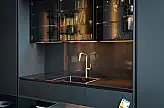 Die Hochschrankwand bietet großzügigen Stauraum und sorgt für ein aufgeräumtes Erscheinungsbild. Ergänzt wird sie durch verglaste Vitrinenelemente mit integrierter Beleuchtung, die Gläser und Accessoires stilvoll in Szene setzen und der dunklen Küche Tiefe sowie Wohnlichkeit verleihen. Offene Regale mit warmem Licht und natürlichen Akzenten setzen bewusst wohnliche Kontrapunkte und verbinden Küche und Wohnraum harmonisch miteinander.