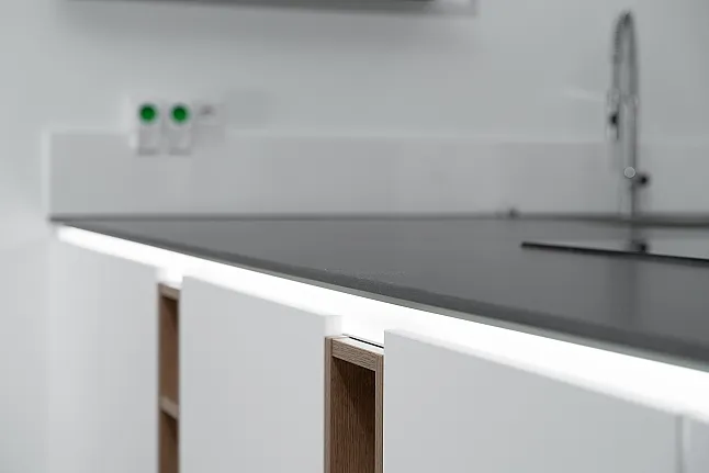 Die Kombination aus eleganten, matten Alpinweiß-Fronten und warmen Holzelementen verleiht dieser Küche einen modernen, urbanen Charakter. Die kontrastreiche, dunkle keramische Arbeitsplatte harmoniert perfekt mit den hellen Oberflächen und sorgt für eine klare, zeitlose Optik. Offene Regale aus Holz und dezente Beleuchtungselemente bringen zusätzliche Wärme und Funktionalität in den Raum.