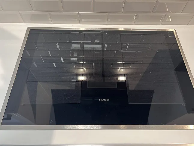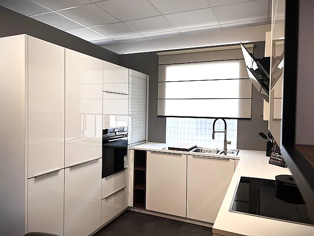 Eine sehr praktische Zeitlose Küche in U-Form, weiss Hochglanz lackiert mit Griffleisten und Essplatz