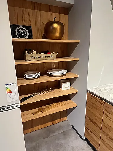 Offene Regalnische mit massivem Holzrückwandpaneel – ideal für dekorative Elemente oder schnellen Zugriff auf Kochutensilien.