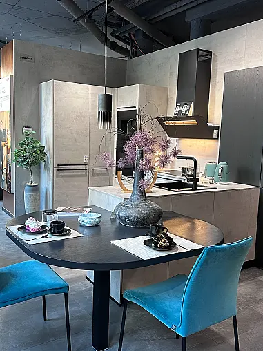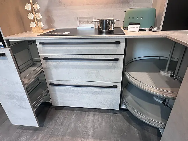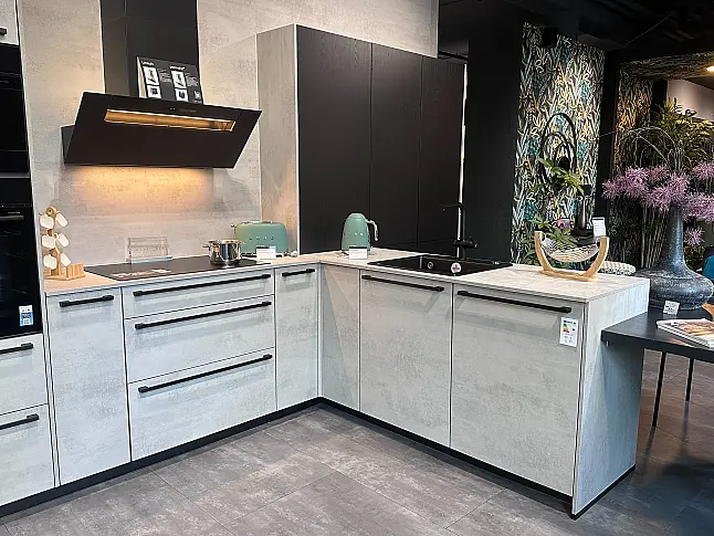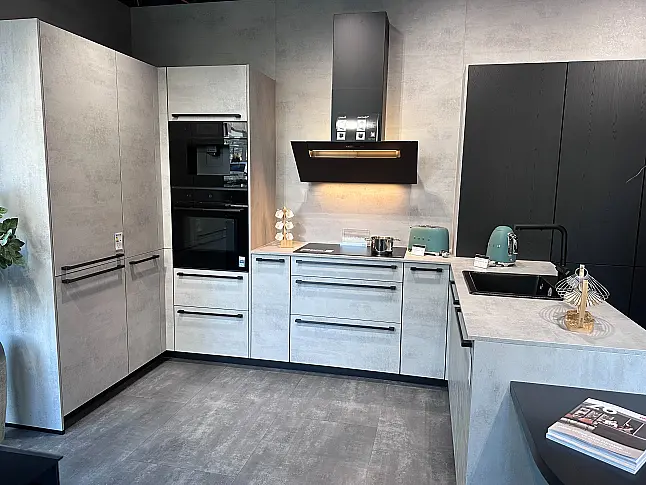 Nobilia Ausstellungsküche RIVA 892 Beton Grau NB / STRUCTURA 403 Eiche Netro NB U-Küche mit integriertem Essbereich inkl. Geräten