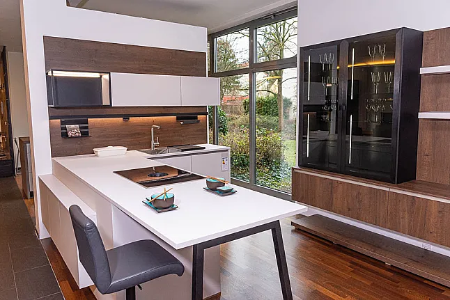 Häcker Küche mit exklusiver beleuchteten Glasvitrine