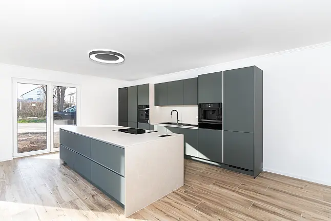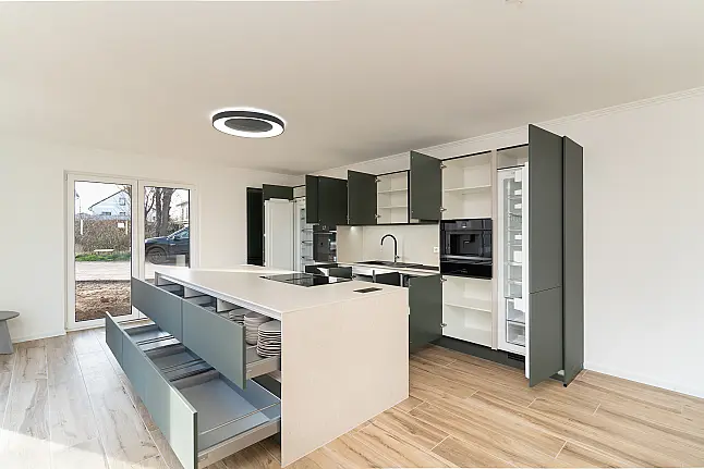 Diese exklusive Küche in Mineralgrün ultramatt begeistert mit einem modernen, ruhigen und dennoch außergewöhnlichen Farbkonzept. Die samtigen, reflexionsarmen Fronten schaffen eine edle und harmonische Atmosphäre, während die hochwertige keramische Arbeitsplatte dem Raum eine luxuriöse und zugleich natürliche Note verleiht.