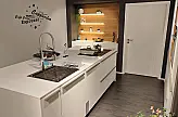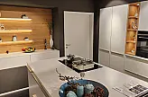 Die Küche überzeugt mit einer weißen Arbeitsplatte aus Quarzstein, matt lackierten Fronten in Weiß, sowie einem eleganten Regal und einer Rückwand aus Echtholz – inklusive stimmungsvoll beleuchteter Regalelemente.