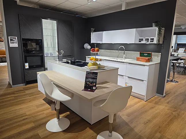 Inpura Top Soft Polarweiß Charmante Küche in Polarweiß mit Arbeitsplatte in Taj Mahal Extra, mit Sitzmöglichkeit, Backofen, Mikrowelle