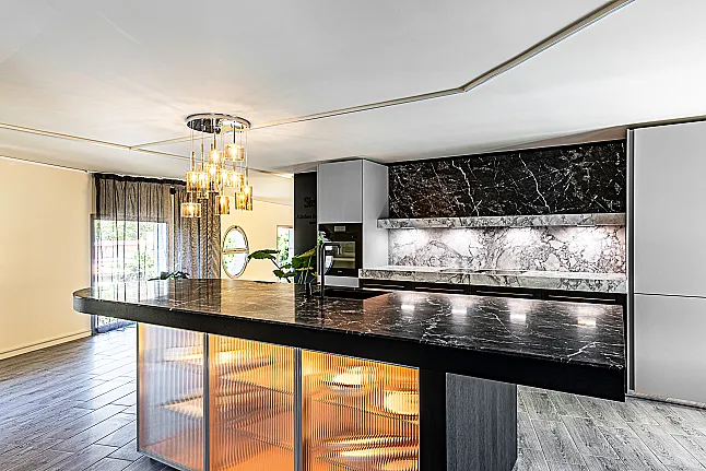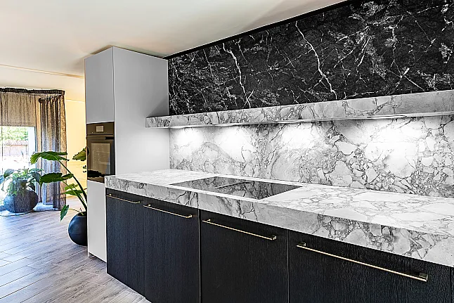 Die angebotene Küche beinhaltet Manufaktur Lackfronten sowie Eiche schwarzmatte Furnierfronten. Die Arbeitsplatten bestehenaus Marmor white fantasy sowie Grigio Carnico patinato.