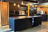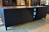 Küche kann natürlich auch umgeplant werden und es können Schränke zugekauft werden, Kücheninsel steht auf dem Gestell von NEXT125 in mattschwarz, kann auch auf Füße gestellt werden mit Sockelleiste.