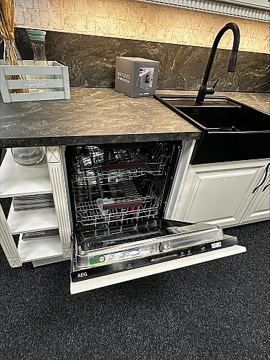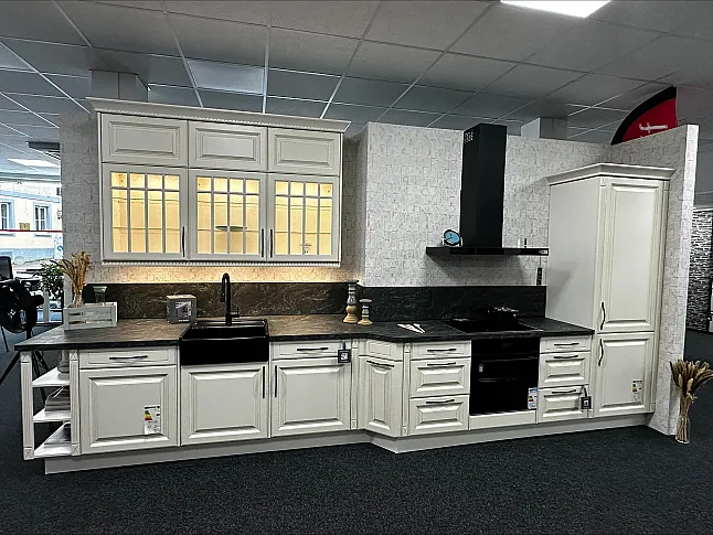 Wunderschöne Landhausküche im aktuellen Magnolia gewischt mit Arbeitsplatten in Quarzit Grün Nachbildung . Mit beleuchteten Glasoberschränken verziert mit Landhaus-Kranz und Lichtleiste als Schutz zur Wand dienst die Nischenverkleidungen. Das 60cm Keramik-Spülen-Modul hat links die Geschirrspüler Nische und zur Abrundung der Landhausküche gibt es ein Landhausregal mit Pilaster und einen Auszugsschrank. Zusätzlich hat die Küche noch einen herausziehbaren Tisch der als Essplatz oder als zusätzliche Arbeitsfläche dienen kann.