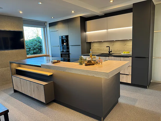 Eine Kombination aus puristisches Design in Graphit Matt mit warmen Holzdekor-Fronten