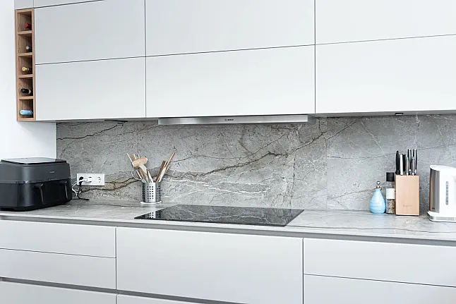Diese stilvolle Küche vereint ein klares, minimalistisches Design mit hochwertigen Materialien und moderner Ausstattung. Die hellen, matten Fronten schaffen eine zeitlose Eleganz, während die keramische Arbeitsplatte und die Nischen in Steinoptik dem Raum eine natürliche, luxuriöse Atmosphäre verleihen. Offene Holzelemente setzen warme Akzente und erzeugen ein harmonisches Gesamtbild.