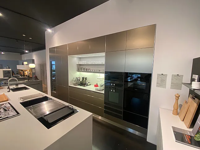bulthaup A3AX Aluminium sandbeige, grifflos Bulthaup Hochschrankseite mit Aluminiumoberfläche sandbeige