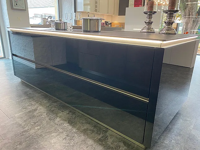Insel gifflos mit Edelstahl Griffleisten . Led Beleuchtung unterhalb der Arbeitsplatte .