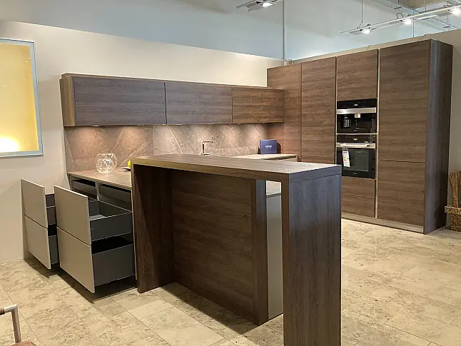 allmilmö RIVA MANICO Grifflose große Design U-Küche mit Theke in Modern Art schlamm matt Tabakeiche