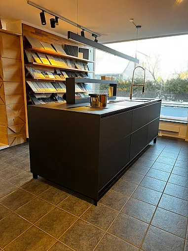 Die Kücheninsel wirkt hochwertig, mit einer dunklen, matten Oberfläche und integrierter Spüle.