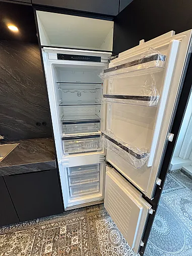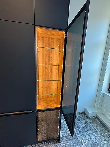 Diese exklusive Küche besticht durch ihre dunklen, eleganten Farbtöne und moderne Gestaltung mit schwarzen Griffen. Die obersten Schränke sind mit Push-System ausgestattet, was ein komfortables und zeitgemäßes Öffnen ermöglicht. Die Keramikarbeitsplatte unterstreicht den hochwertigen Charakter der Küche und sorgt für ein einheitliches, edles Gesamtbild.