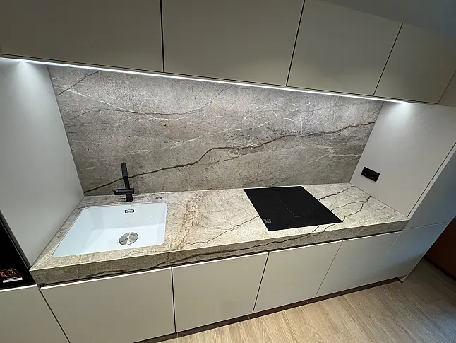 Moderne grifflose Küche mit matten Fronten und Keramikarbeitsplatte