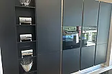 Diese hochwertige Ausstellungsküche überzeugt durch ihr modernes, griffloses Design und eine elegante Front in Schwarz seidenmatt. Die Kombination mit Edelstahl verleiht der Küche eine besonders edle und zeitlose Ausstrahlung.