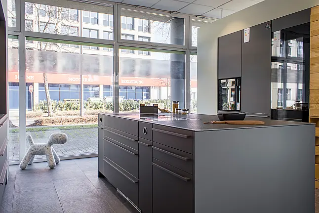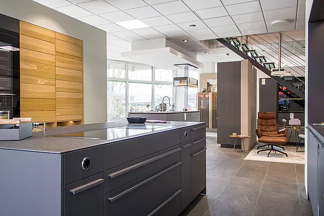 Diese hochwertige LEICHT Ausstellungsküche Modell EVO verbindet moderne Linienführung mit ausdrucksstarken Materialien und technischer Präzision.