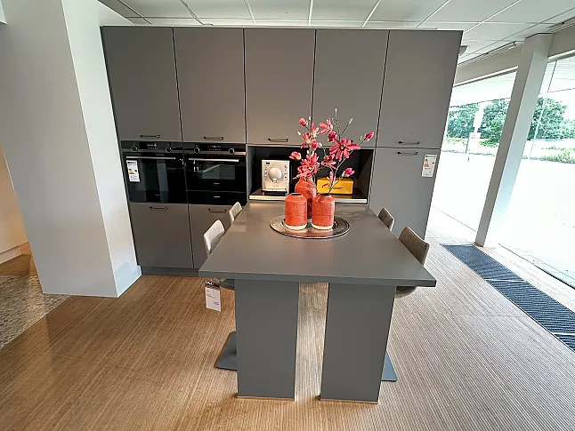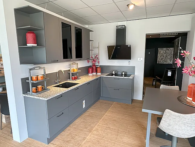 Erleben Sie das unvergleichliche Angebot unserer Ausstellungsküche in charmantem Mattlackfinish Grau. Diese Küche vereint gemütlichen und zugleich zeitlos-modernen Stil mit einer durchdachten, funktionalen Gestaltung in L-Form mit einer Hochschrankzeile.