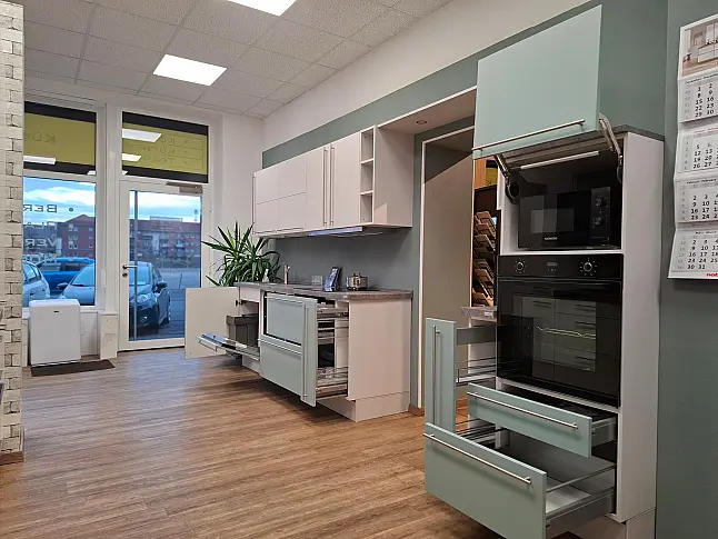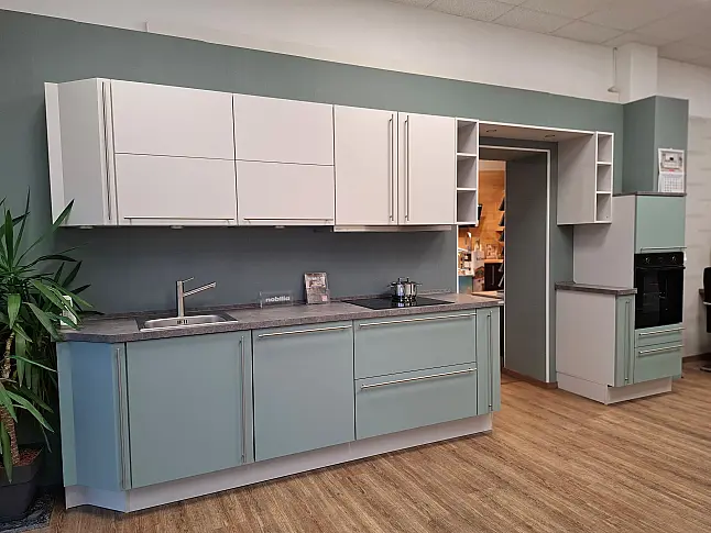Nobilia Küche aus der Ausstellung zu Abverkauf. Lacklaminat Aqua supermatt