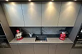 - Die Schubladen und Türen in den beiden Geräteschränken von Dampfgarer/Mikrowellen-Kombi und Pyrolyse-Backofen links sowie von Kaffeemaschine und Weinkühler rechts sind mit Tip-On-Beschlägen ausgestattet und die Fronten dieser Schränke auf Maß passend zu den Geräten gefertigt, so dass sich eine besonders ruhige Optik ohne die häufig üblichen Ausgleichsblenden ergibt.