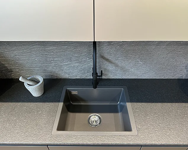 - Das großzügige Spülbecken besteht aus sehr hochwertiger Feinsteinzeug-Keramik und ist flächenbündig in die Arbeitsfläche eingelassen, in die es sich auch farblich sehr harmonisch einfügt.