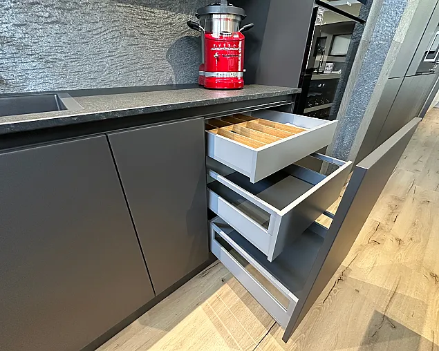 Unsere Musterküchen geben wir nur unverändert ab, wie sie sind. Es handelt sich um eine nicht umplanbare, exakt so vorhandene Küche und nicht um einen "Planungsvorschlag". Möbel und Naturstein sowie Geräte und Zubehörteile gehören fest zur Küche und können nicht getauscht, geändert, weggelassen oder einzeln erworben werden. Eine Umplanung der Küche, eine Bestellung zusätzlicher Schränke, Natursteinplatten oder Zubehörteile sowie eine Änderung von Geräten, Fronten, Natursteinmaßen, Schrankanordnungen usw. über die weiter oben im Detail beschriebenen Aufstellmöglichkeiten hinaus ist nicht möglich. Weiterhin ist es auch uns leider vollkommen unmöglich, eine Küche nach abweichender Planung zu auch nur annähernd ähnlichen Konditionen wie diese Musterküche zu besorgen; daher können wir leider entsprechende Planungsanfragen nicht bearbeiten und beantworten.