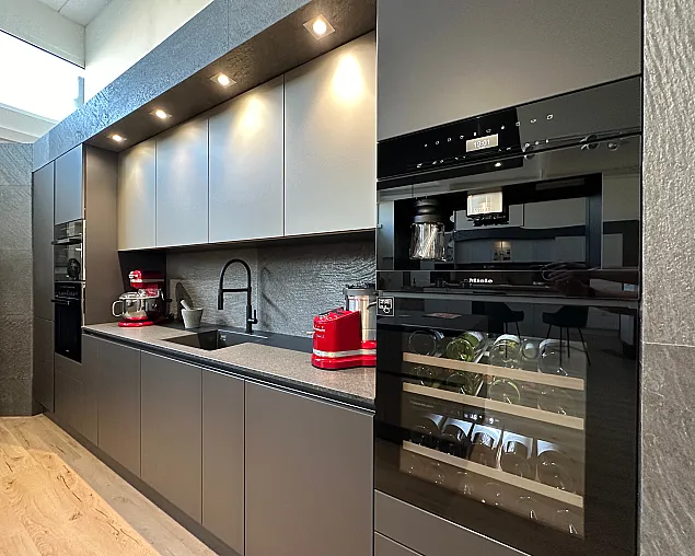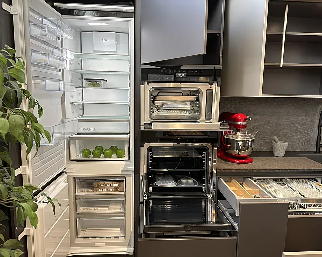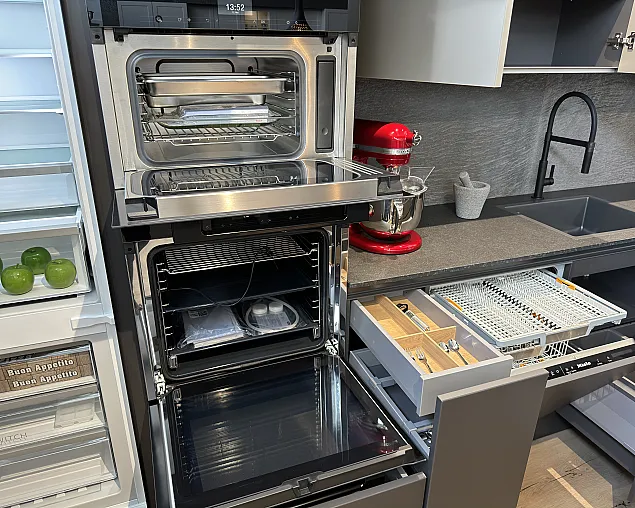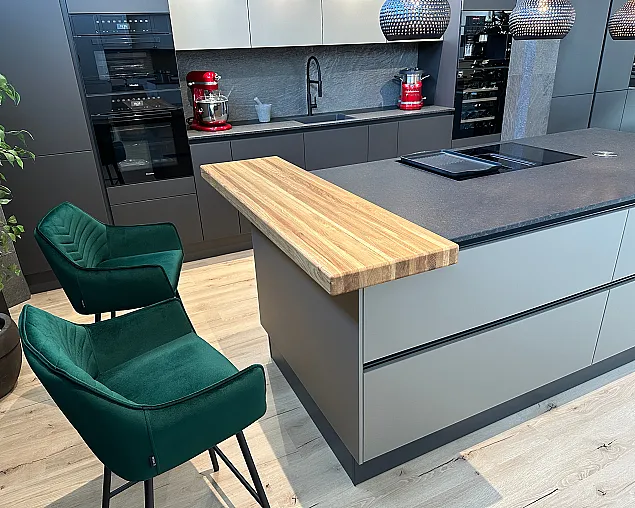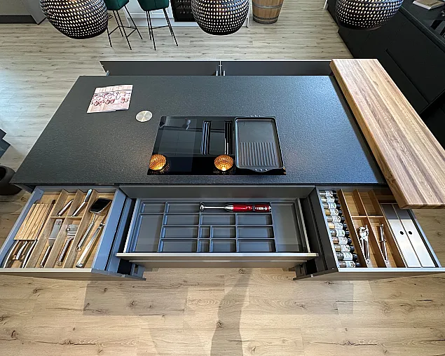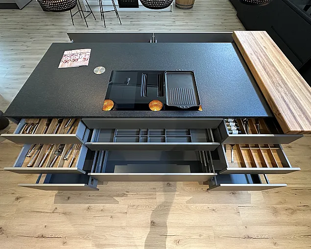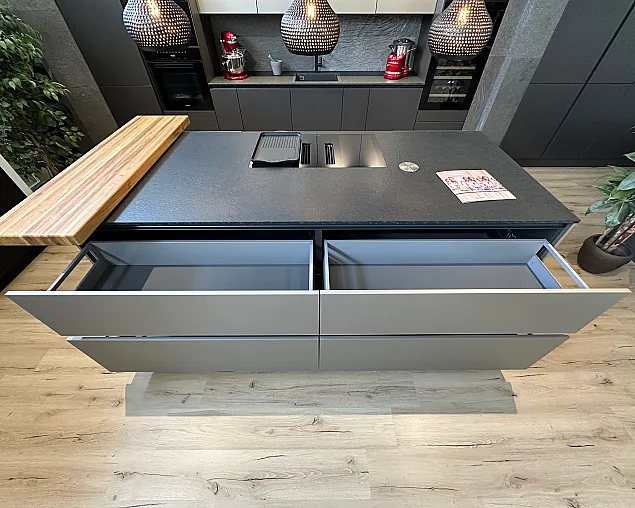 Die begeisternde und sehr umfangreiche Geräteausstattung ist weiter unten im Detail beschrieben! Ebenso wie der extra große Kühlschrank als verborgener Star, die vielseitigen Öfen, der Top-Geschirrspüler, die Kaffeemaschine und der farblich passend abgestimmte 2-Zonen-Weinklimaschrank begeistert die "Performance" Muldenlüftung mit Flächeninduktion und marktführenden Filtereigenschaften dank des einzigartigen Permalyt-Geruchsfilters, bei dem erstmals keine Filter mehr manuell gewartet oder gewechselt werden müssen - was nicht nur entspannende Bequemlichkeit mit sich bringt, sondern vor allem auch erhebliche Folgekosten spart. Zum integrierten Induktionskochfeld mit praktischen Eigenschaften wie abrufbaren Temperaturstufen zum Schmelzen, Warmhalten und Fortkochen passt perfekt die darauf abgestimmte, extra große Teppanyaki/Plancha Brat- und Grillplatte, die vom Kochfeld automatisch erkannt wird, so dass hier z.B. perfekt Steaks und Gemüse gegrillt werden können. Wir haben sehr lange nach so einer perfekt abgestimmten Teppanyaki-Platte gesucht und liefern dieses kleine und bei unseren Kunden sehr beliebte Schmankerl daher gleich mit!