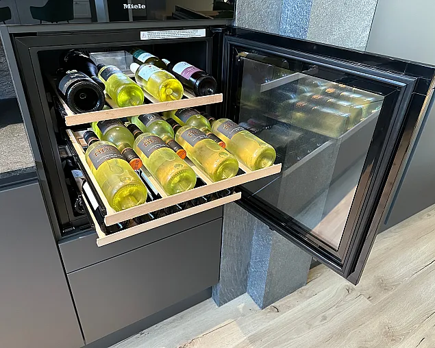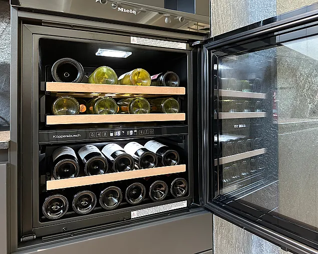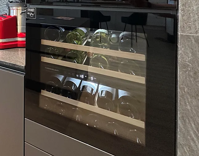- Im linken Hochschrank sitzt der Kühlschrank im außergewöhnlich großen Sondermaß und mit genialer Flexibilität: Die "Multi Switch"-Schubladen hinter der unteren Tür können entweder als zweiter Kühlbereich oder als Gefrierschubladen eingestellt und verwendet werden - einfach so, wie es für Sie gerade am nützlichsten ist! Näheres zu den beiden speziellen Frischeschubladen in der Mitte erfahren Sie weiter unten bei den Detailbeschreibungen der enthaltenen Geräte. Der von Schüller passend gefertigte Schrank verfügt über eine verdeckt integrierte und somit "unsichtbare" passive Belüftung für den Kühlschrank, so dass kein optisch störendes Lüftungsgitter die aufgeräumte Optik stört. Gleiches gilt übrigens rechts beim Schrank mit dem sichtbar eingebauten 2-Zonen-Weinkühler, der mit seiner LED-Beleuchtung Ihre Lieblingsflaschen chic präsentiert und ein unaufdringliches optisches Highlight ist!