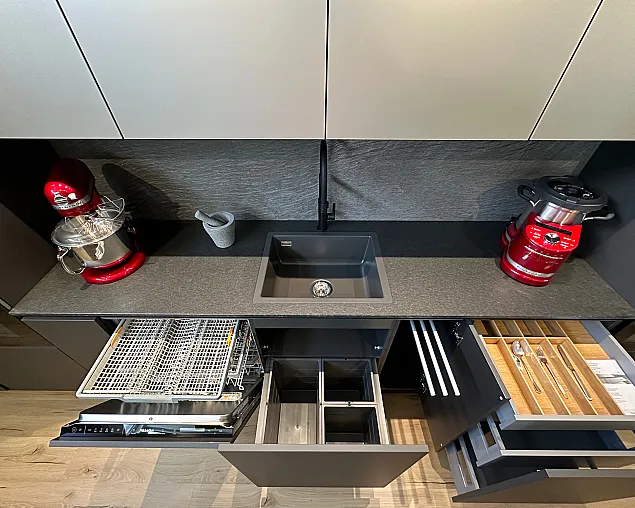 Außerdem kann im Schrank rechts neben der Spüle optional ein tolles Quooker-Komplettsystem (3XBLKCUBE mit CUBE FILTER STARTERSET) oder sogar das ganz neue BLANCO All-in-One-System (CHOICE.All mit CHOICE.Icona in Schwarz) eingebaut werden! Viele Kunden, die einmal die praktischen Qualitäten eines solchen Systems im Alltag erlebt haben, möchten es bereits nach wenigen Tagen nicht mehr missen! Kochend heißes Wasser für die Teezubereitung, zum Anrühren von Saucen, zum Desinfizieren, zum Blanchieren... und dazu jederzeit gekühltes & gefiltertes, sprudelndes oder stilles Wasser abrufbereit - kein Kistenschleppen mehr! (Gegen den sehr fairen Mehrpreis von nur 2200 € tauschen wir die in dieser Küche enthaltene Armatur gegen das Quooker-Komplettsystem mit schwarzer Armatur "FLEX". Und das fortschrittliche, hochintegrierte BLANCO High-End-System können wir sogar zum Mehrpreis von nur 300 € gegenüber dem Quooker-System anbieten. Zu den Vorteilen und Unterschieden der Systeme beraten wir Sie gerne ausführlich - am Telefon oder bei einem Besuch in unserem Haus! Bei beiden Systemen bleibt übrigens an der jeweiligen Armatur der Vorteil eines flexiblen Schlauchs ähnlich wie bei der normalen, zur Küche gehörenden Armatur erhalten.)