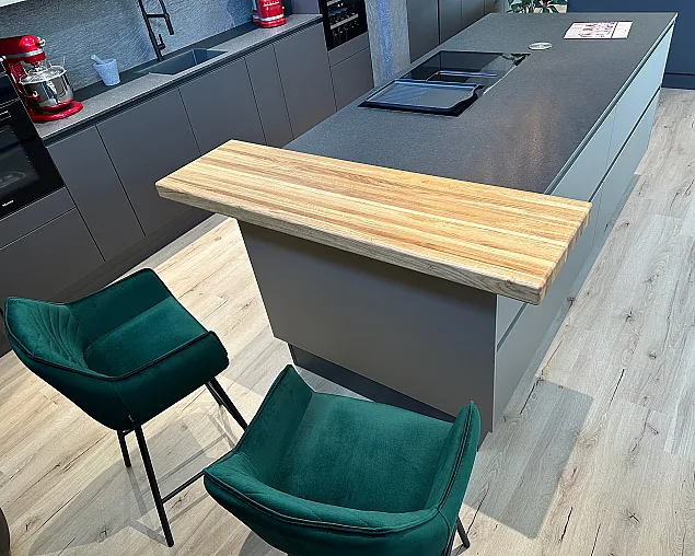 Unübertroffen harmonieren diese einzigartigen Fronten - bei "Lavaschwarz" handelt es sich übrigens um einen hauseigenen und unglaublich beliebten Schüller-Spezialfarbton - mit dem für die Arbeitsplatten verwendeten anthrazit-farbenen Naturstein mit interessanten etwas helleren Einschlüsse und der sehr aufwändigen, immer beliebter werdenden Oberflächenausführung "geflammt und gebürstet" mit ihrer geradezu monumentalen optischen und haptischen Wirkung. Perfekt abgerundet wird dieses noble Ensemble durch die 6 cm starke, massive Thekenplatte in weitestgehend naturbelassenem, in gleichmäßigen Stäben verleimtem und dann lediglich geschliffenem und geöltem Eichenholz. Diese durchdachte Kombination edler Materialien strahlt sanfte und unaufdringliche Exklusivität und gleichzeitig unnachahmliche wohnliche Geborgenheit aus.