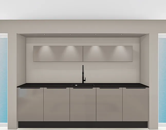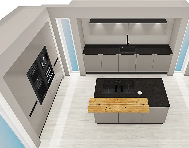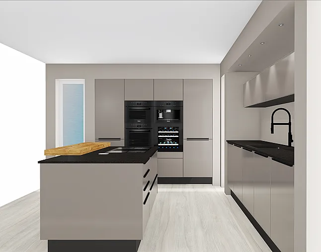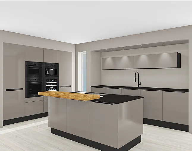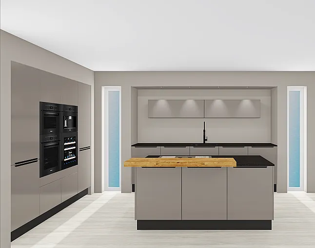 - Fronten in super edlem Look und dennoch verblüffend unempfindlich, wie es nur mit diesem neuartigen HighTech-Materialsystem möglich ist, das es nur von einem einzigen Zulieferer gibt und das entsprechend teuer ist. Jahrelang haben wir gewartet, ob nicht mal ein neues Frontmaterial und/oder sogar ein neuer Farbton eingeführt wird, dem wir zutrauen, über einen kurzfristigen Trend hinaus der neue zeitlose Maßstab für die nächsten Jahre zu werden. Und hier ist tatsächlich beides der Fall! Erstens verfügt diese Küche über das neuartige Frontmaterial "RAUVISIO crystal" aus der Forschung von den Spezialisten von Rehau, das Schüller schlicht "Smartglas" nennt und aufgrund des unnachahmlichen Looks, der extremen Splitter- und Verzugsfestigkeit, der eleganten Kante (wie bei Glas mit einer angeschliffenen Fase, jedoch im Gegensatz zu Glas fugenlos!), der Unempfindlichkeit und der leichten Pflege zum Nachfolger von ESG-Glasfronten erkoren hat, die bisher schon unsere Lieblinge waren. Zweitens wurde hier ein spezieller Farbton aus der neuen "Deep Collection" von Rehau gewählt, den Schüller sehr treffend "Taupe Metallic Matt" nennt, denn genau so sieht er aus! Ein erdig-warmer, moderner und gemütlicher Grau-Braun-Beige-Ton, der so exakt die neuesten Einrichtungstrends trifft und dennoch bereits jetzt ein Klassiker ist - auch, weil er so extrem kombinationsfreudig ist zu Grau- und Beigetönen, zu Holz, zu Beton. Er strahlt Ruhe und Hochwertigkeit aus und ist etwas ganz besonderes - auch wegen seiner geradezu faszinierenden matten, bei Lichteinfall unfassbar edel schimmernden Oberfläche, die mit ihrer Tiefenwirkung ("deep") einzigartig ist und genau richtig die Lücke zwischen heller und dunkler Küche füllt. So ein traumhaftes Frontmaterial existierte bisher schlichtweg nicht und wir und unsere Kunden haben nur darauf gewartet und sind begeistert! Zumal obendrein die Pflegeeigenschaften besser sind als bei Lackfronten, man Fingerabdrücke weniger sieht als bei anderen unifarbenen Frontmaterialien mit ähnlichem Helligkeitsgrad, und man im Gegensatz zu den bisherigen Glasfronten nicht mit Fugen an den Kanten und mit deutlichen Verzugsproblemen leben muss - denn Rehau hat diese Fronten als komplettes System entwickelt mit schützendem Kantenmaterial, das ohne Fuge angebracht wird ("Nullfuge"), und einem auch farblich angepassten rückseitigen Material, das als sogenannter Gegenzug wirkt und die Front zu einem stabilen Gesamtverbund macht. Das ist tatsächlich HighTech an einer Stelle, an der Sie es vielleicht nicht vermutet hätten, nämlich schon beim Möbelbau! (Übrigens wirken die Fronten auf den computergenerierten Grafiken stellenweise ein wenig zu glänzend. Es handelt sich jedoch tatsächlich um matte Fronten, die lediglich einen beeindruckenden Tiefeneffekt aufweisen. Gerne können Sie sich unter unseren anderen Angeboten umschauen, dort finden Sie eine komplette, echt fotografierte Küche aus unserer Ausstellung in dieser Farbe, die Ihnen einen unverfälschten Eindruck bieten kann - und die Sie natürlich gerne hier nach Terminabsprache auch besichtigen können!)